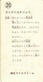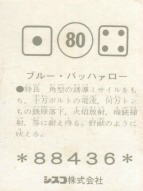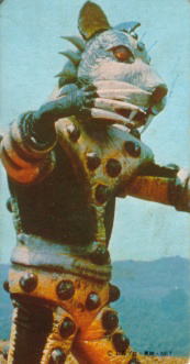 | ブルー・バッファロー 特長 角型の誘導ミサイルをもち、 十万ボルトの電流、何万トンもの鉄球 落下、火焔放射、機銃掃射、等に 耐え得る。野獣のように吠える。 |