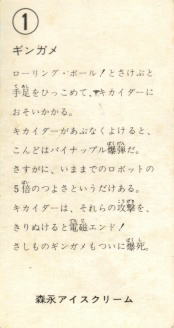 キカイダーに変身 <スイッチ、オン、ワン、ツー、スリー> 世界の平和を守り、謎の犯罪組織ダーク 一味と戦うために、人造人間キカイダーに 変身するのだ。 |