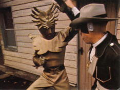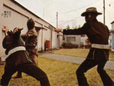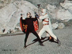 | 279 レインボーマンへの変身 あるポーズをとり、呪文を誦える。即ち、九字をきって印を結び「アノクタラサンミヤクサンボダイ」と誦えると、全身が七彩の不思議な光芒に包まれレインボーマンとなる。これによって、7つの姿をもったレインボーマンが誕生 |
