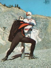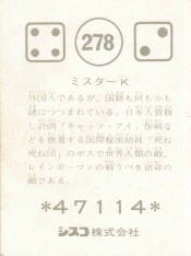 | 278 ミスターK 外国人であるが、国籍もなにもかも 謎に包まれている。日本人皆殺し計画 「キャッツ・アイ」作戦などを推進する国 際秘密結社「死ね死ね団」のボスで世界人類の敵、レインボーマンの戦うべき宿命の敵である。 |