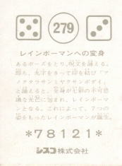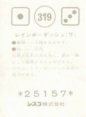 | 319 レインボーダッシュ[7] ●象徴 太陽をあらわす。 ●色 白色 白色と七彩の光を発し、敵を一瞬にして眩惑することができる。 これは、レインボーマンの最高の能力である。 |