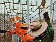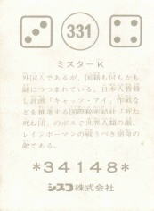 | 331 ミスターK 外国人であるが、国籍もなにもかも 謎に包まれている。日本人皆殺し計画 「キャッツ・アイ」作戦などを推進する国 際秘密結社「死ね死ね団」のボスで世界人類の敵、レインボーマンの戦うべき宿命の敵である。 |