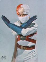 | 315 レインボーマンへの変身 あるポーズをとり、呪文を誦える。即ち、九字をきって印を結び「アノクタラサンミヤクサンボダイ」と誦えると、全身が七彩の不思議な光芒に包まれレインボーマンとなる。これによって、7つの姿をもったレインボーマンが誕生 |