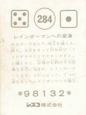 | 284 レインボーマンへの変身 あるポーズをとり、呪文を誦える。即ち、九字をきって印を結び「アノクタラサンミヤクサンボダイ」と誦えると、全身が七彩の不思議な光芒に包まれレインボーマンとなる。これによって、7つの姿をもったレインボーマンが誕生 |