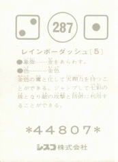 | 287 レインボーダッシュ[5] ●象徴 金をあらわす。 ●色 金色 金色の鷹と化して天翔力を持つことができる。ジャンプして七彩の珠となり敵の攻撃と防御に利用することができる。 |