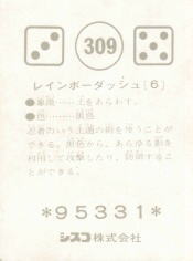 | 309 レインボーダッシュ[6] ●象徴 土をあらわす。 ●色 黒色 忍者のいう土遁の術を使うことができる。黒色から、あらゆる影を使用して攻撃したり、防御することができる。 |