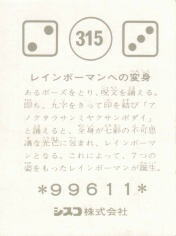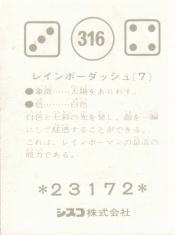 | 316 レインボーダッシュ[7] ●象徴 太陽をあらわす。 ●色 白色 白色と七彩の光を発し、敵を一瞬にして眩惑することができる。 これは、レインボーマンの最高の能力である。 |