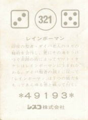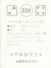 | 320 レインボーダッシュ[7] ●象徴 太陽をあらわす。 ●色 白色 白色と七彩の光を発し、敵を一瞬にして眩惑することができる。 これは、レインボーマンの最高の能力である。 |
