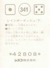 | 341 レインボーダッシュ[7] ●象徴 太陽をあらわす。 ●色 白色 白色と七彩の光を発し、敵を一瞬にして眩惑することができる。 これは、レインボーマンの最高の能力である。 |