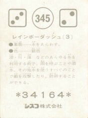 | 345 レインボーダッシュ[3] ●象徴 水をあらわす。 ●色 銀色 池・川・海 などのあらゆる水を利用する術で、雨を呼ぶことや潜水、その他水を使うすべてのことで敵を攻撃したり、防御することができる。 |