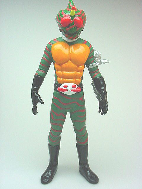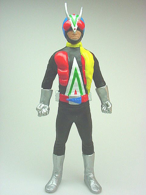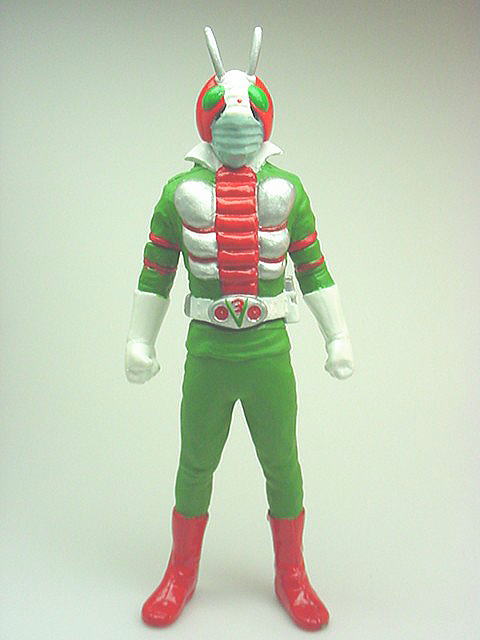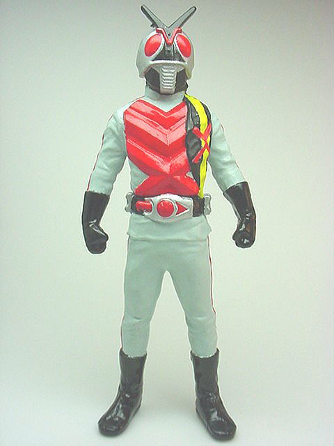 | 仮面ライダーV3 <正体>風見 志郎 家族を「デストロン」に殺され志郎自身も 重傷を負ったが1号、2号によって「V3」と して生まれかわった。体内に秘められた26 の超戦力で「少年ライダー隊」と共に悪に 立ち向かう力と技の戦士。 <敵>デストロン <主な怪人>テレビバエ、マシンガンスネーク ドクバリグモ、クサリガマテントウ <必殺技>V3きりもみキック、V3ホッパー <マシン>ハリケーン |