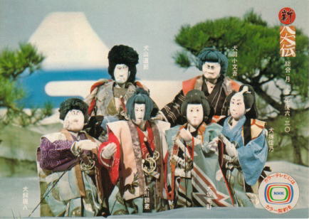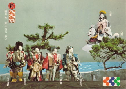 新八犬伝はNHKの人形劇 人気を定着させた番組でこの後、 「飛べ紅孔雀」や「プリンセス プリン・プリン」などが続いた。 語りは故坂本九氏で黒子姿で 解説など楽しく聞かせエンディン ソングも自ら歌っていた。 当時のNHKのノベルティの定番 「絵葉書」や「シール」にもなっていた。 八犬伝のシール |