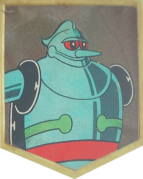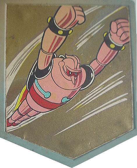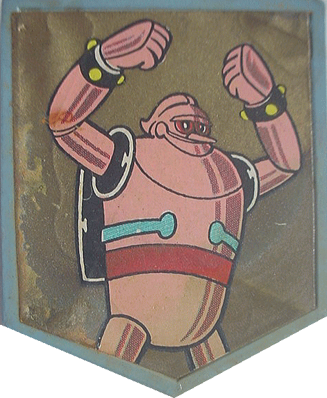 昭和40年前後のレトロなバッジ。 5角形のプラスチック版に紙を貼ったもので 裏に「ヤ」の字風の簡単なピンがついている。 特にスポンサー名も入ってないので確か駄菓子屋のおまけ・・・かな。 はっきりとした詳細は不明です。